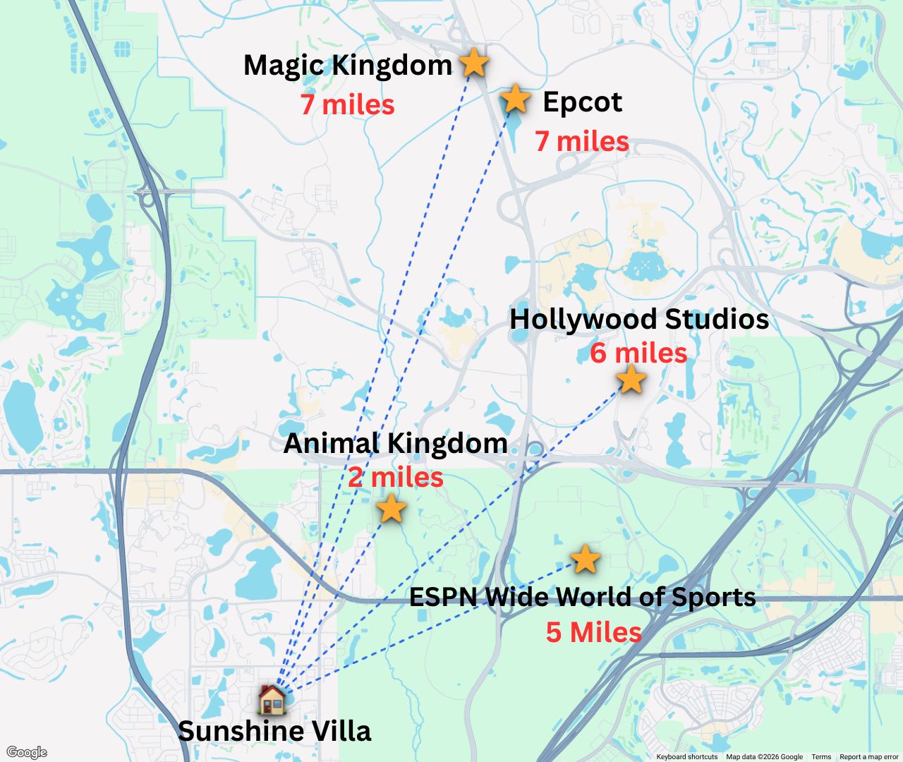 Sunshine Villa is nestled inside Windsor Hills Resort, the closest gated resort-style vacation community to Walt Disney World®, so your family is always just minutes from the magic. Spend less time in the car and more time together—whether that’s early mornings at the parks, relaxing afternoons by the pool, or evenings winding down in a safe, family-friendly resort. With unbeatable convenience, spacious accommodations, and resort amenities everyone will love, Sunshine Villa is the perfect home base for creating unforgettable Disney memories.